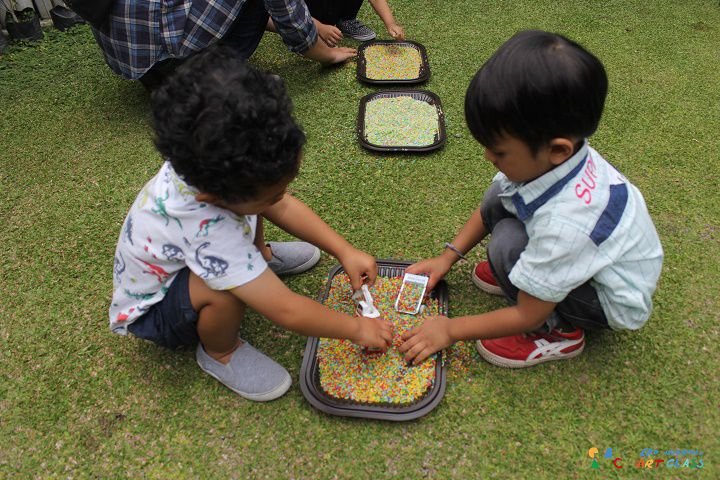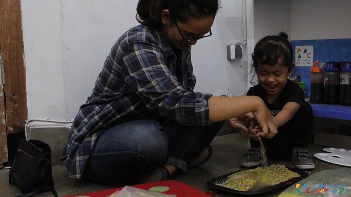 Kali ini Art Friday #17 bertemakan “Rainbow Rice: For Sensory Play”. Kegiatannya menyenangkan sekali! Mom dan Kid bersama-sama berkarya untuk membuat permainan sensorik dari bahan beras. Anak-anak sangat antusias ketika diajak untuk meremas-remas butiran beras yang banyak agar pewarna makanan bisa tercampur dengan merata. Tangan-tangan kecil setiap peserta terlihat aktif sekali dan penuh dengan warna-warni pewarna makanan. Beberapa peserta bahkan memainkan beras warna-warni dengan mainan yang mereka bawa sendiri! Seru sekalii.