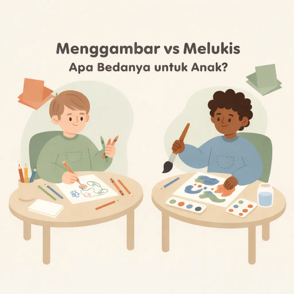 Artikel ini membahas perbedaan menggambar dan melukis khusus dalam konteks anak, bukan teori seni orang dewasa.