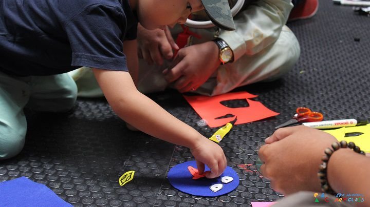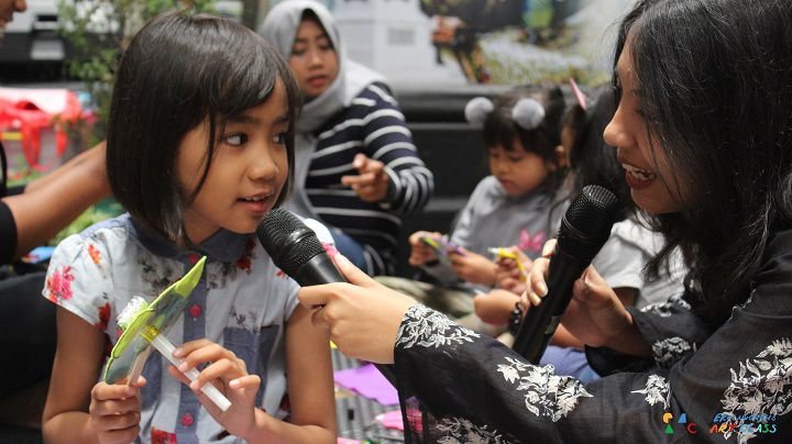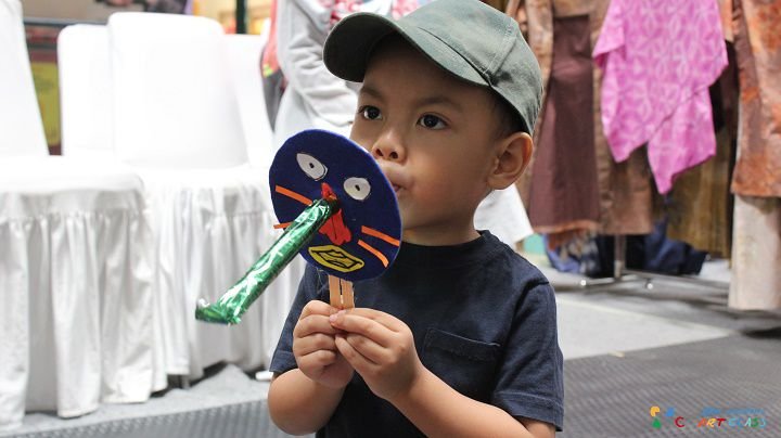 Peserta diajak berkarya dengan tema membuat permainan sederhana menggunakan benda-benda keseharian. Bahan utama dari workshop ini adalah CD bekas yang sering ditemukan di sekitar kita. Anak-anak mengekspresikan kesukaan mereka terhadap berbagai jenis binatang dan membentuknya dengan teknik craft atau kerajinan. CD bekas ini diolah menjadi stik karakter yang nantinya ditambahkan dengan ornamen terompet pesta. Sehingga karya ini bisa dimainkan dengan cara meniup terompet pestanya. Lucu yaa!